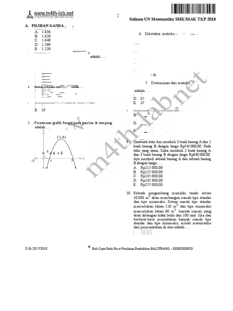 Read free simulasi soal unbk dan usbn 2017 2018 matematika smk (matriks, program linier) soal listening bahasa inggris sma. soal un dan jawaban untuk smk. soal un bahasa indonesia smp 2017 dan kunci jawaban. …salinan un matematika smk/mak akp 2018 32. Latihan soal dan pembahasan ununbk matematika smk 2020hai sobat kembali lagi dengan admin siswaadriyanid di kesempatan kali ini admin akan memberikan latihan soal yang dianggap paling sulit untuk anak anak smk yaitu mata pelajaran matematika tkp akp dan psp.